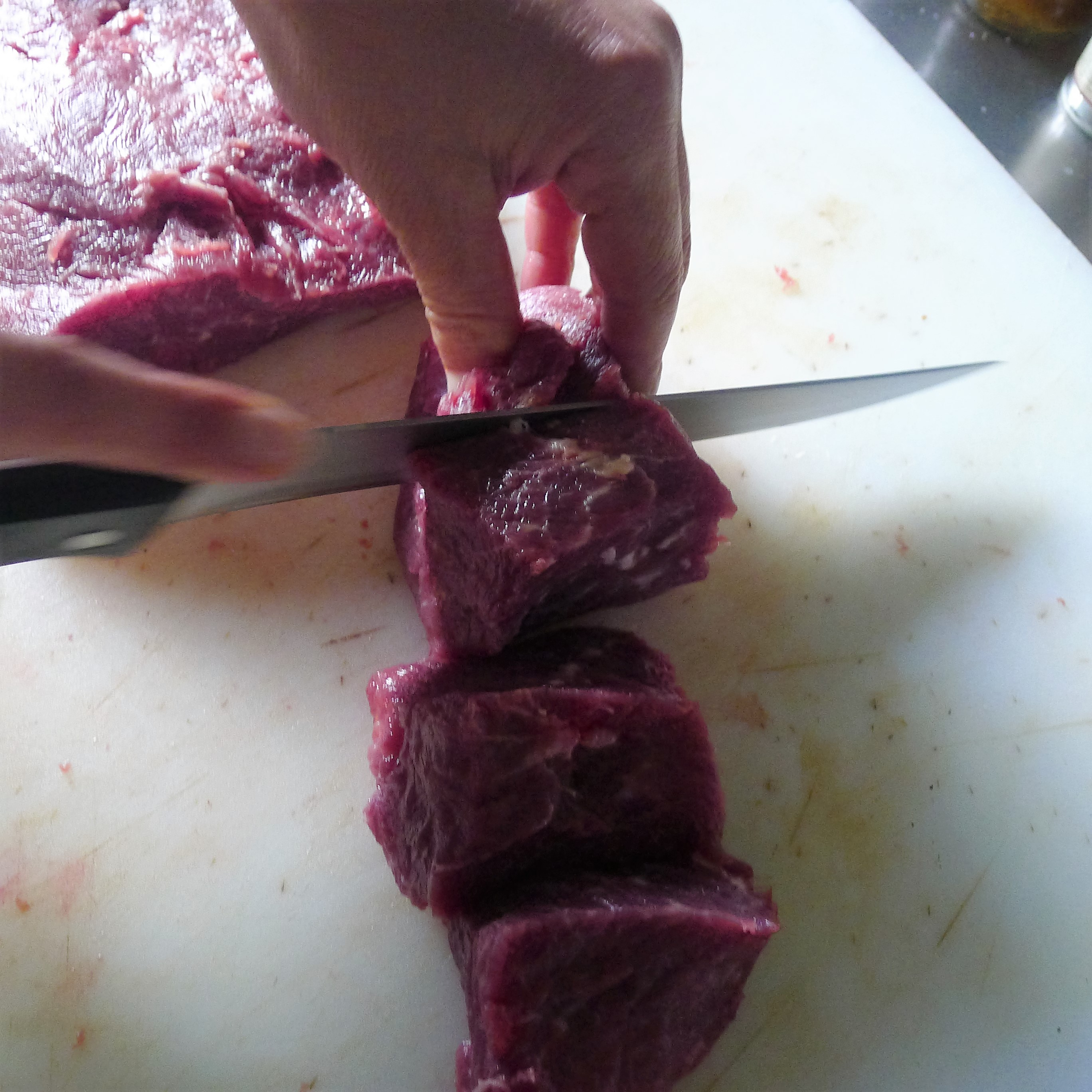 - Se taie carnea în bucățele aproximativ egale (5-7 cm)