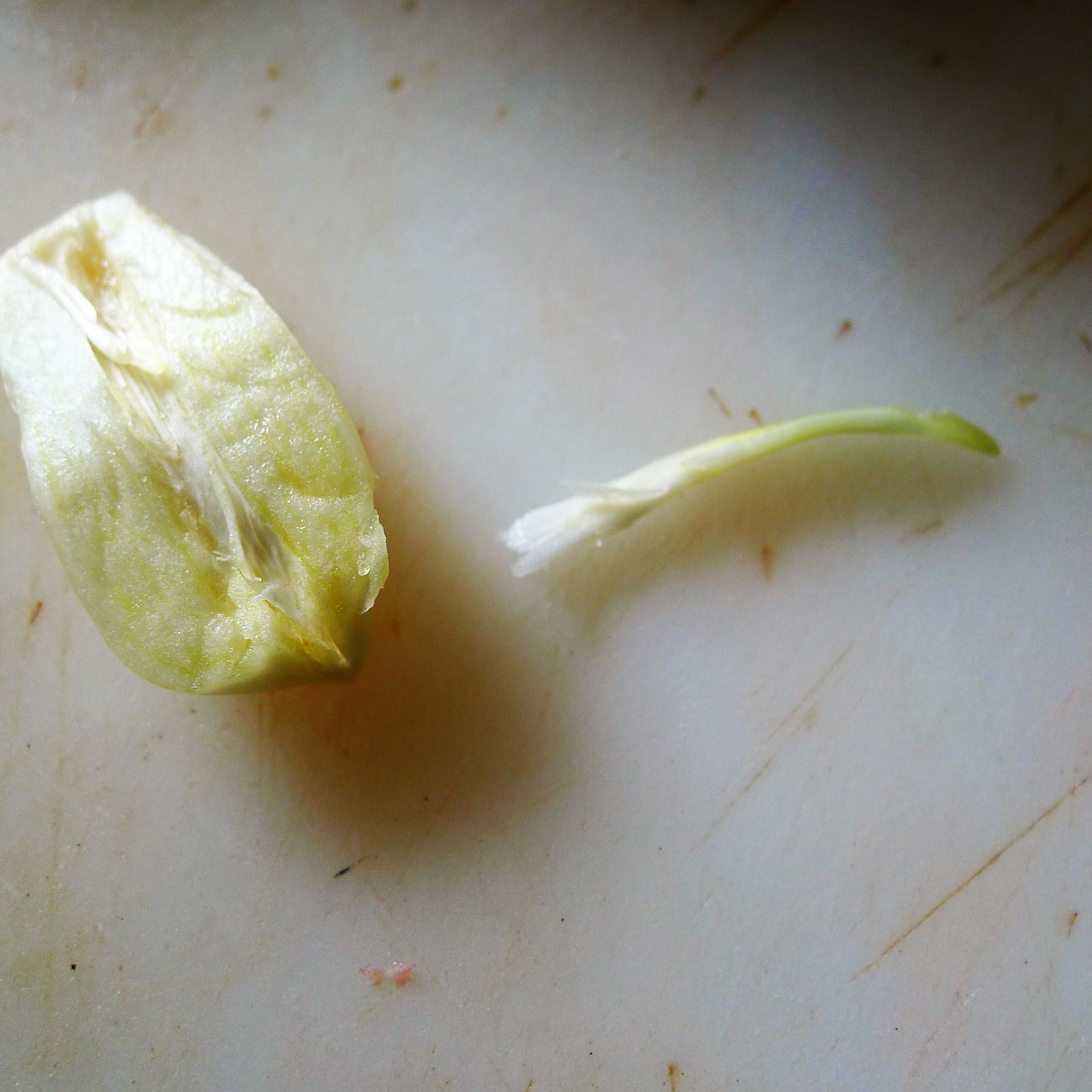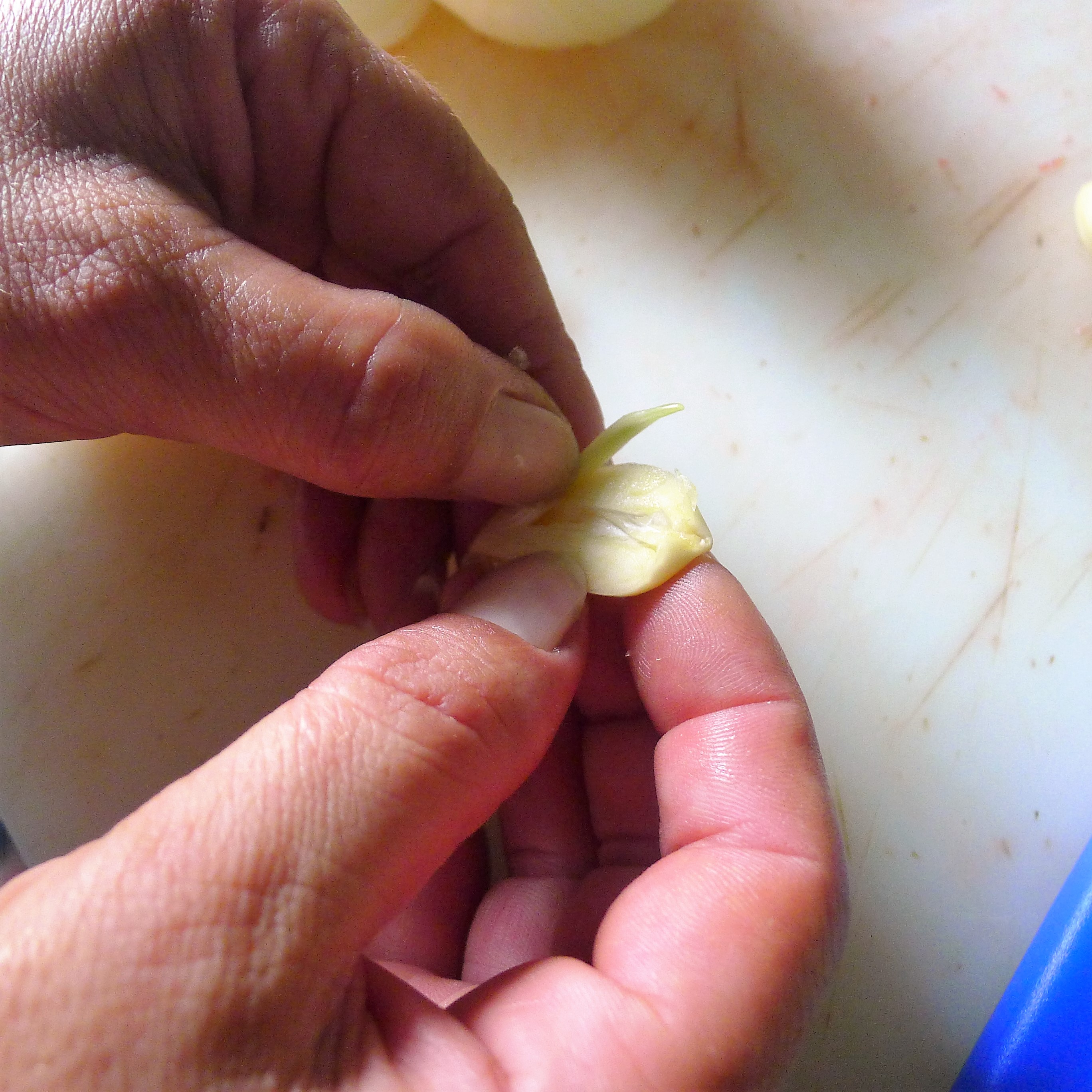 - Usturoiul – cu el este o problemă, și aici sunt foarte exigentă: trebuie cu orice chip să scoateți germenii – de cele mai multe ori au o culoare foarte pală, atunci când tăiați un cățel de usturoi în două găsiți în mijloc o bucată mică, verde, responsabilă de problemele de digestie care apar