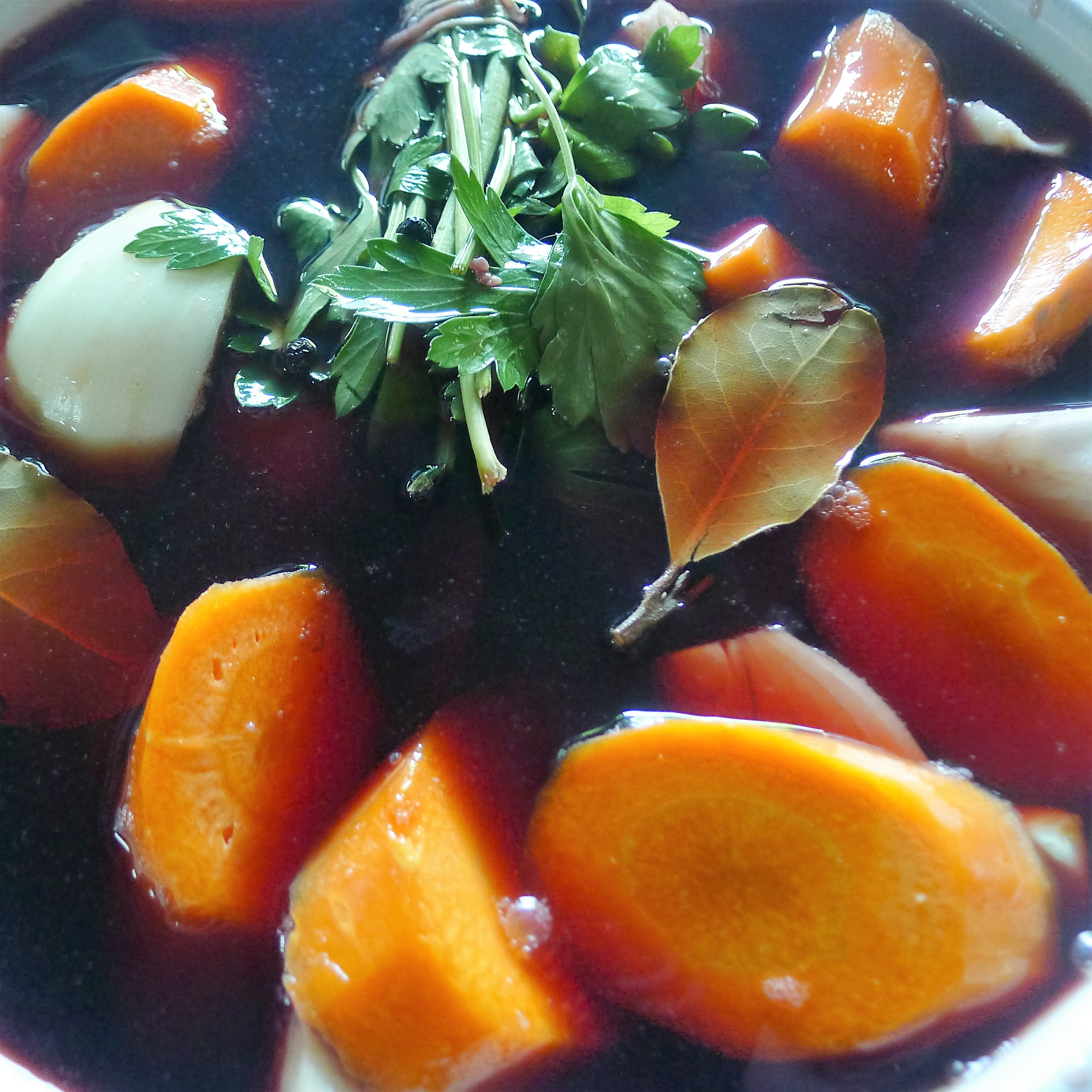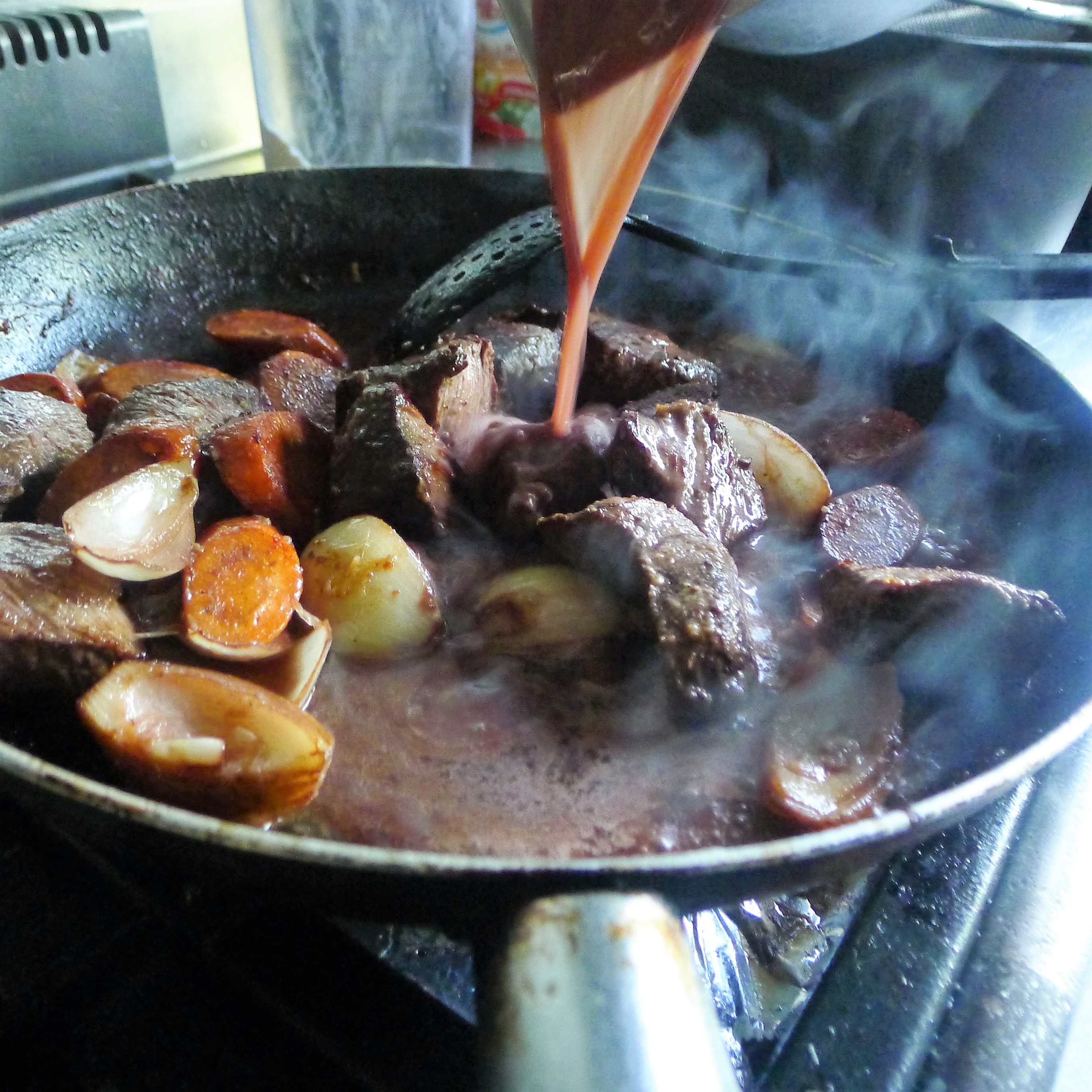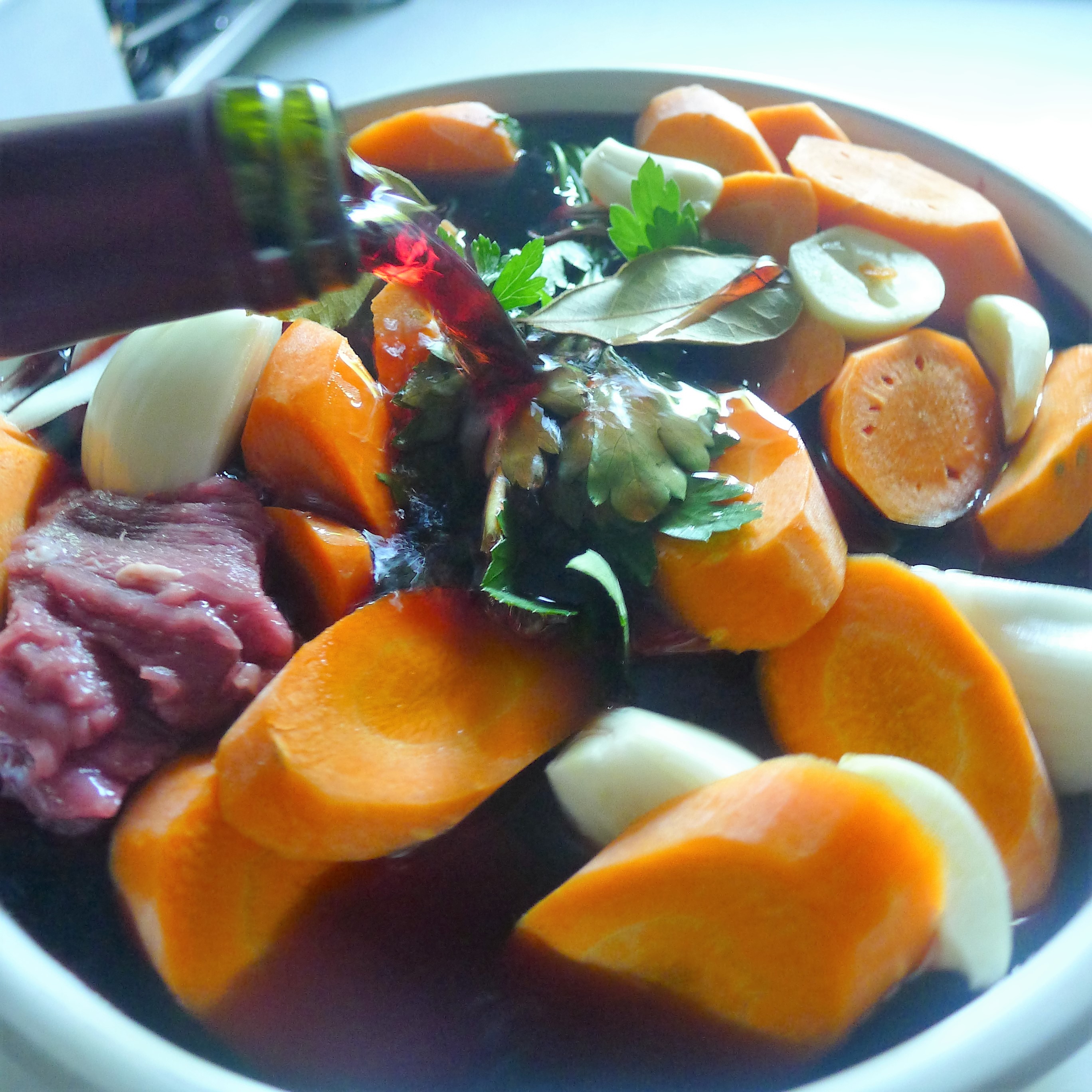 - Puneți carnea tăiată + ceapa + usturoiul + pătrunjelul + piperul + vinul – suficient cât să acopere carnea – nu veți folosi tot vinul astăzi – la rece pentru o noapte sau o zi, între 8 și 12 ore. Știu că dacă îl veți întreba pe bunul prieten Google, vă va spune că vinul trebuie să fie flambat, dar la Clos noi nu flambăm vinul – pentru că ar suferi — și oricum vinul va fierbe cel puțin 3 ore și își va pierde din alcool
