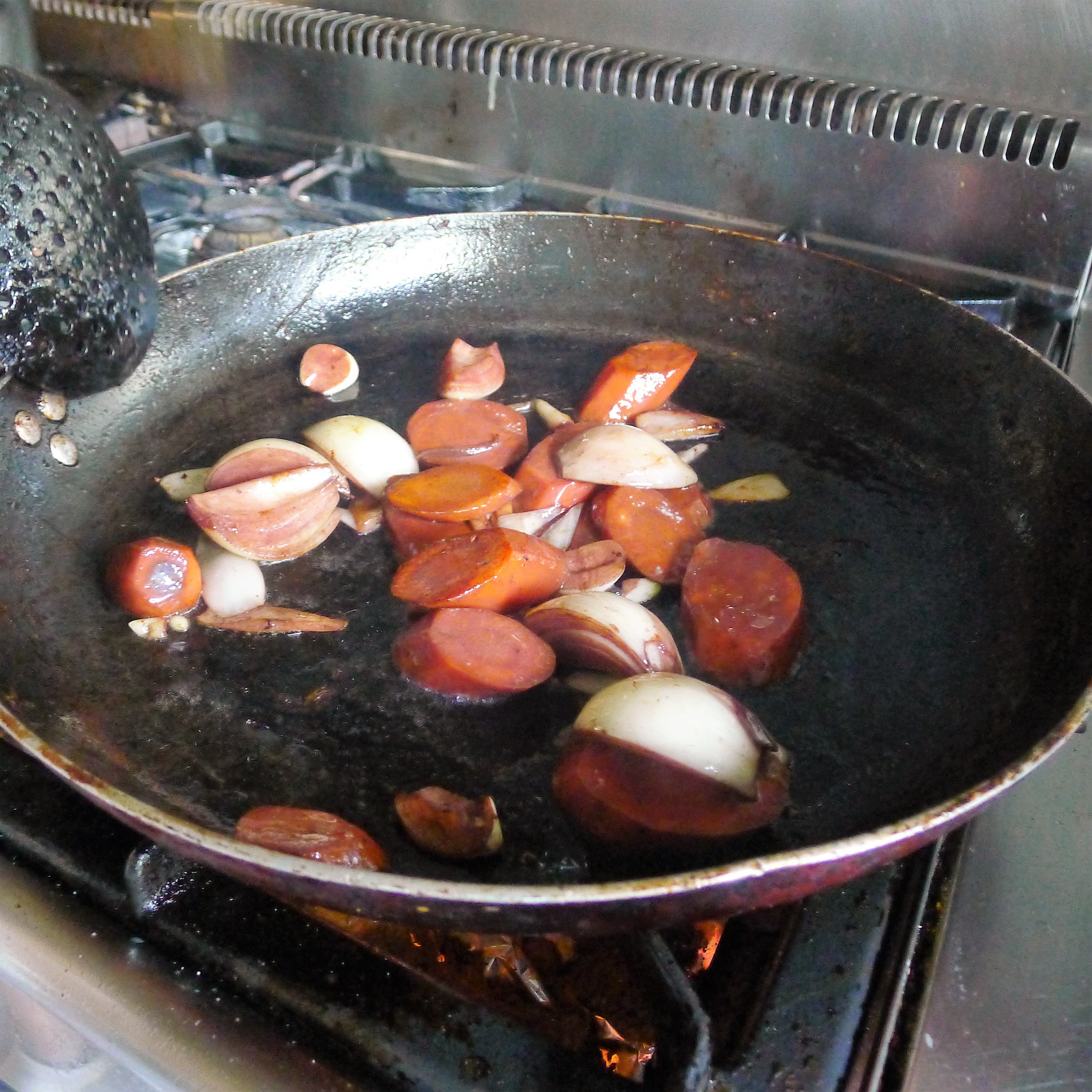 - În aceeași tigaie adăugați putin ulei, dacă e nevoie, apoi adăugați legumele – morcov, ceapă, usturoi – le trageți la tigaie – adică le amestectați bine la foc mare – iar când sunt calde bine, adaugati făina în ploaie – înțelegeți la ce mă refer, de sus în jos, fără violență, în bucătărie se lucrează încet și cu calm, în general