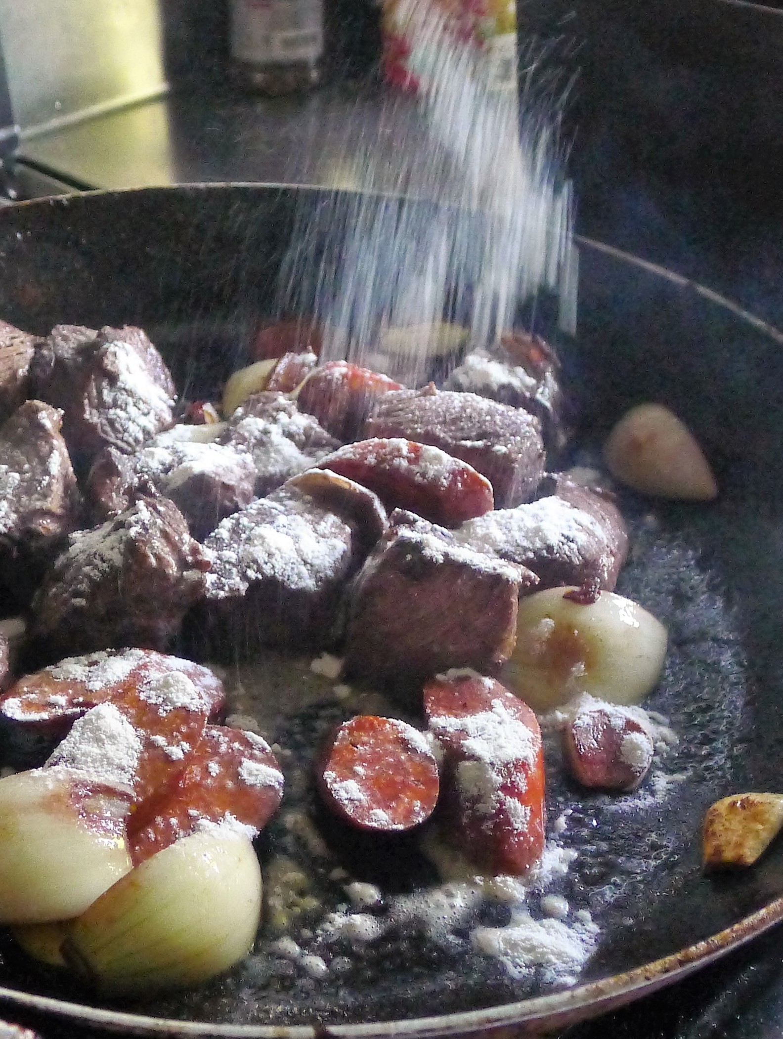 - Cand făina este gătită – vă uitați la poză și veți vedea cum trebuie să arate – puneți carnea înapoi, amestecați bine și adăugați vin de la marinat și zeama cărnii, apoi lăsați să fiarbă aproximativ 10 minute. Veți vedea că sosul începe să se îngroașe, dar nu prea mult, iar dacă carnea nu este total acoperită – adică dacă lipsește lichid este normal – adăugați vin și amestecați din nou