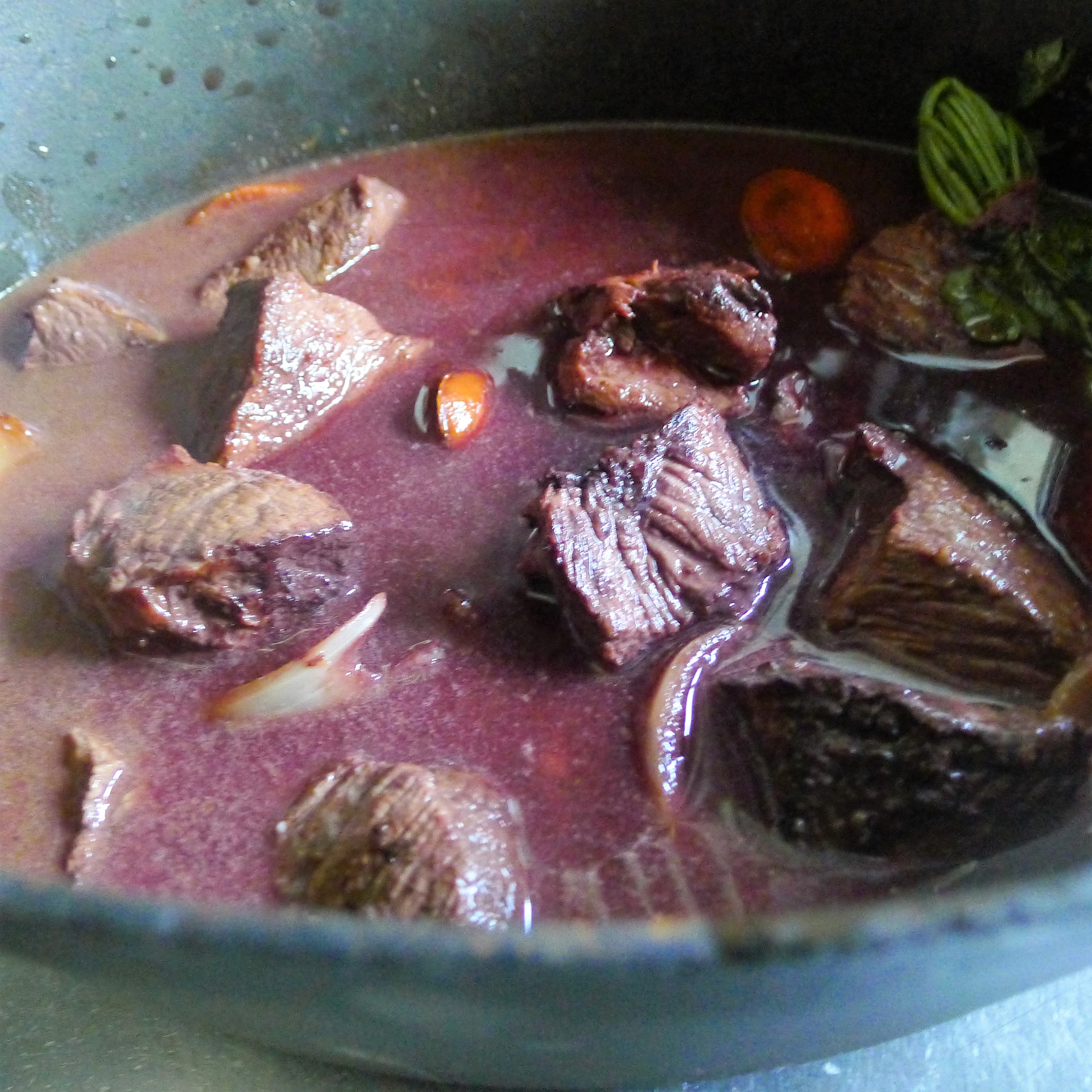 Fie că vorbim de perși sau de romani – martor ne este celebrul bucătar Apicius – sau de Evul Mediu, și-aici ne stă mărturie faimoasa carte de bucate „Le Viandier”, o carte de referință a bucătăriei franceze de la vremea aceea, carnea de vită – și nu doar aceasta, ci și cea de cocoș, struț sau de iepure – este cel mai adesea fiartă în vin, adăugând, în funcție de perioada despre care vorbim, diverse condimente: ghimbir, cardamom, sau așa cum se obișnuiește în zilele noastre, ceva încă și mai simplu, și-anume sarea și piperul. (Dacă vă interesează subiectul condimentelor în bucătărie, spuneti-mi și voi reveni asupra subiectului).