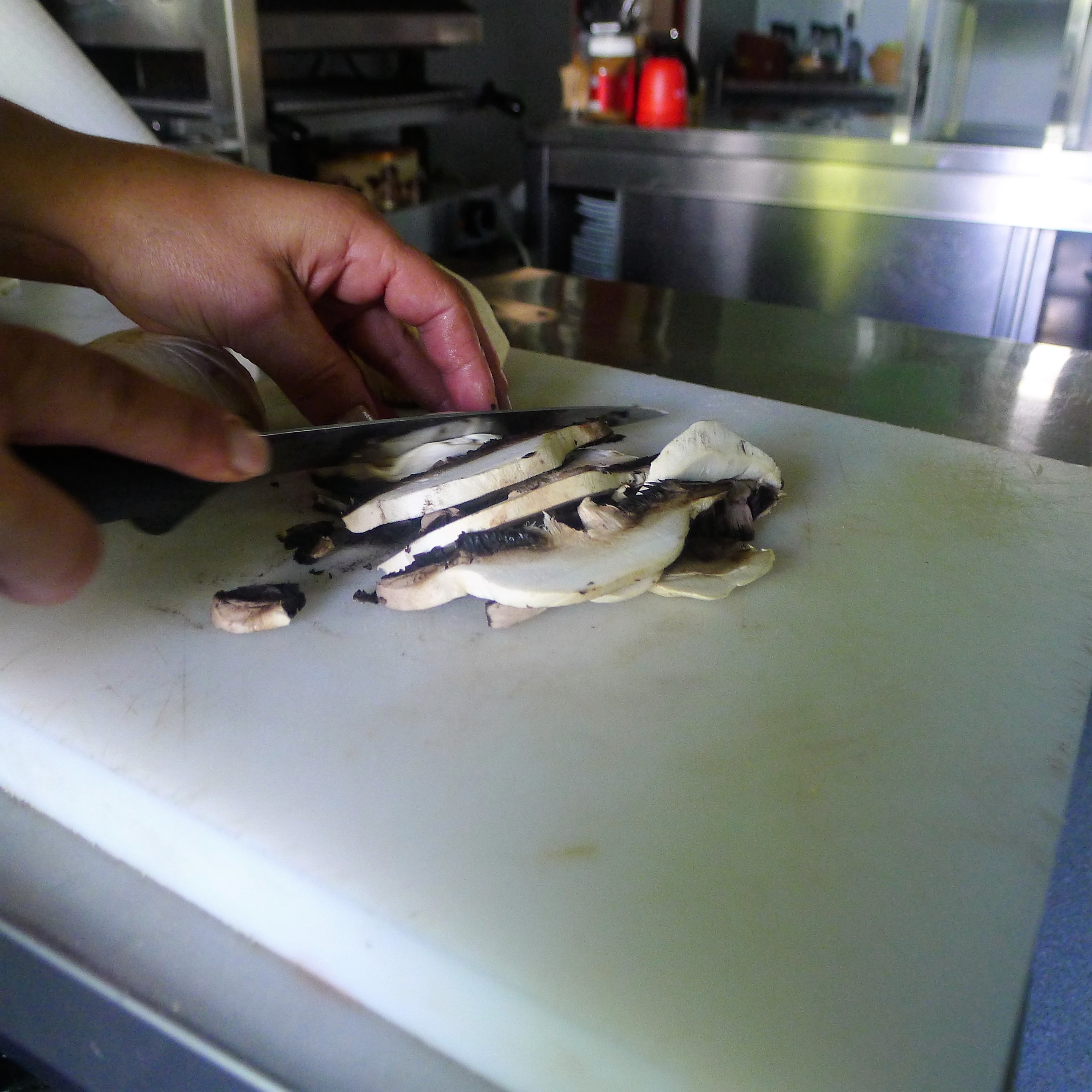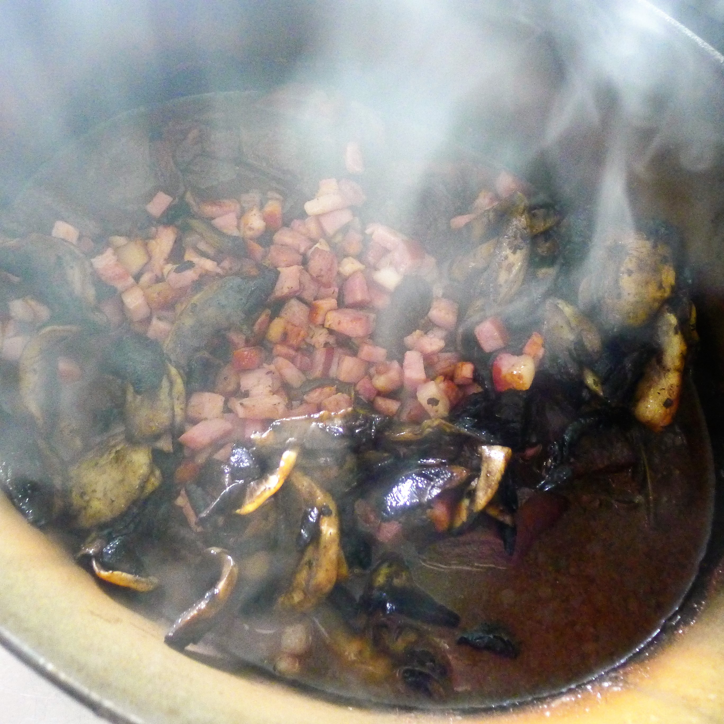 - După două ore și jumătate verificați ușor cu vârful cuțitului carnea – ea trebuie să fie încă puțin fermă, tăiați kaizerul în bucățel, si ciupercile în felii fine