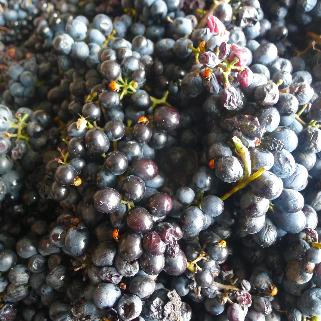 Attente, qui parfois me fait prendre des risques énormes : si il pleut cela peut être la catastrophe ou pas. Et puis il y a les prédateurs : les oiseaux, les guêpes, les sangliers et même si nous avons une grande quantité de protecteurs comme les coccinelles -essayez de compter sur la photo ci-dessous et vous verrez qu’elles sont nombreuses à nous protéger- cela ne suffit pas toujours car plus on est sucré plus on attire les méchants, un sanglier ça sent de loin si c’est mûr et toc de nuit comme un voleur il arrive avec sa bande et ‘méchamment’ ils vendangent tout, en quelques minutes, et là c’est pas le graal c’est la mort, non heureusement qu’on a pas de photos on les a chassés, gentiment mais sûrement, avant qu’ils n’attaquent. Et puis pour des photos de nuit Anne Marie n’est pas vraiment équipée.